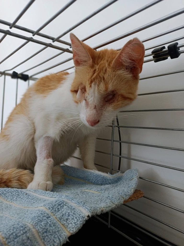 Candela es una gatita ciega que fue recogida recientemente. Al llegar, tuvo que ser operada de urgencia y se le retiró un ojo, además de presentar una fractura antigua en la rodilla. Su pasado es un misterio, pero sabemos que ha pasado por momentos difíciles.